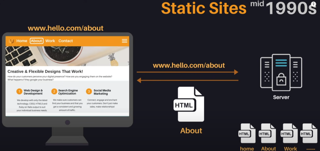 1990년 중반까지는 Static Sites로, 클릭할 때마다 html을 서버에서 불러와서 페이지 전체가 update