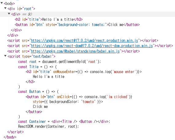 (1) body에는 소스에 작성한대로 Title, Button, Container가 그대로 들어가있다.