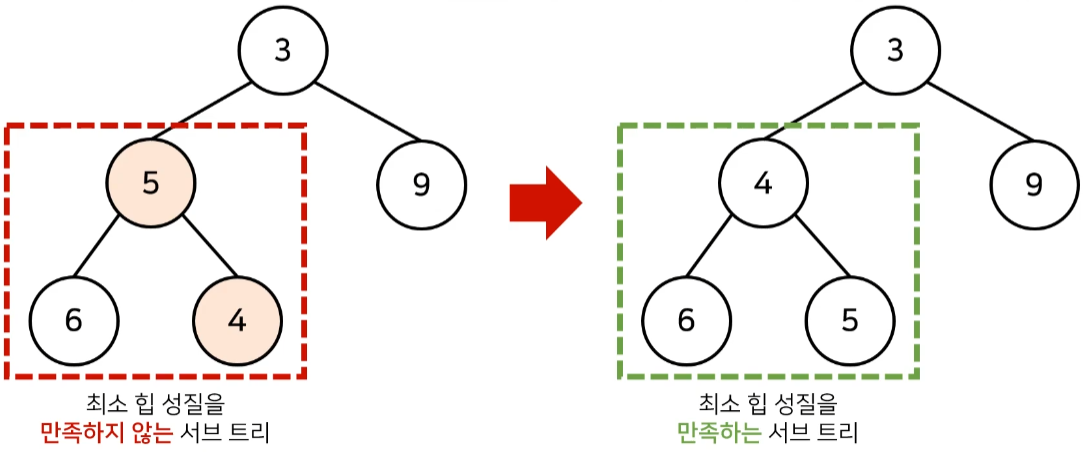 - (상향식) 부모 노드로 거슬러 올라가며, 부모보다 자신의 값이 더 작은 경우에 위치를 교체한다.