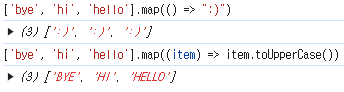 → 함수에서 return item.toUpperCase() 했으니, 결과는 ['BYE', 'HI', 'HELLO']가 된다.